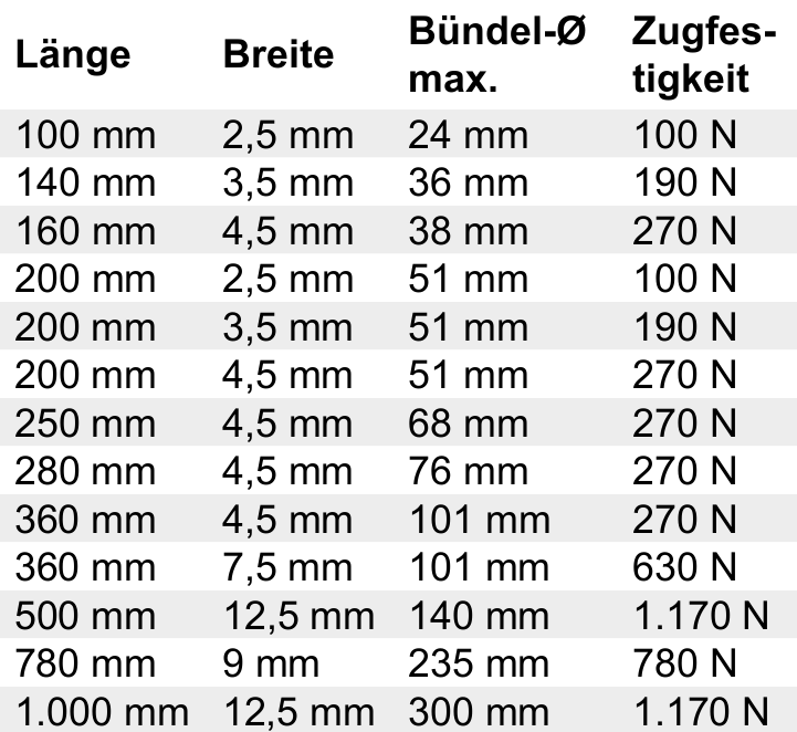 Die Kabelbinder werden aus PA 6.6 hergestellt und unterliegen einer ständigen Qualitätskontrolle.